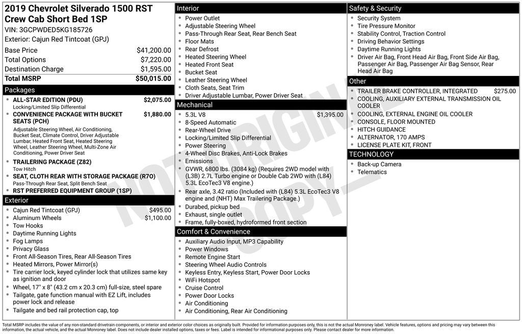 Vaden is pleased to offer 2019 Chevrolet Silverado 1500 RST in Cajun Red Tintcoat, Beautifully equipped with all the essentials and then some! All-Star Edition (Heavy-Duty Rear Locking Differential), Cloth Rear Seat w/Storage Package, Convenience Package (10-Way Power Driver Seat w/Lumbar, Dual-Zone Automatic Climate Control, Heated Driver & Front Passenger Seats, Heated Steering Wheel, Leather Wrapped Steering Wheel, and Manual Tilt/Telescoping Steering Column), Convenience Package w/Buckets Seats (Floor Mounted Console and Front Bucket Seats), Preferred Equipment Group 1SP (12-Volt Rear Auxiliary Power Outlet, 2 USB Ports (First Row), 4-Way Manual Driver Seat Adjuster, 4.2 Diagonal Color Display Driver Info Center, 6-Speaker Audio System, Bluetooth® For Phone, Body Color Grille, Chevrolet Connected Access, Chevrolet w/4G LTE, Color-Keyed Carpeting Floor Covering, Compass, Deep-Tinted Glass, Electric Rear-Window Defogger, Electrical Lock Control Steering Column, Electronic Cruise Control, Front Frame-Mounted Black Recovery Hooks, Front LED Fog Lamps, Front Rubberized Vinyl Floor Mats, High Gloss Black Mirror Caps, Keyless Open & Start, LED Cargo Area Lighting, Manual Tilt Wheel Steering Column, OnStar & Chevrolet Connected Services Capable, Power Door Locks, Power Front Windows w/Driver Express Up/Down, Power Front Windows w/Passenger Express Down, Power Rear Windows w/Express Down, Rear 60/40 Folding Bench Seat (Folds Up), Rear Dual USB Charging-Only Ports, Rear Rubberized-Vinyl Floor Mats, Rear Vision Camera, Remote Vehicle Starter System, Single-Zone Manual/Semi-Automatic Air Conditioning, Steering Wheel Audio Controls, Theft Deterrent System (Unauthorized Entry), and Urethane Steering Wheel), Trailering Package (Hitch Guidance), 8-Speed Automatic, Jet Black w/Cloth Seat Trim, 170 Amp Alternator, 220 Amps Alternator, 3.23 Rear Axle Ratio, 4-Wheel Disc Brakes, 40/20/40 Front Split-Bench Seat, 6 Speakers, ABS brakes, Air Conditioning, Alloy wheels, AM/FM radio, Apple CarPlay/Android Auto, Auxiliary External Transmission Oil Cooler, Brake assist, Bumpers: body-color, Cloth Seat Trim, Delay-off headlights, Driver door bin, Driver vanity mirror, Dual front impact airbags, Dual front side impact airbags, Electronic Stability Control, External Engine Oil Cooler, Front anti-roll bar, Front Center Armrest w/Storage, Front fog lights, Front License Plate Kit, Front reading lights, Front wheel independent suspension, Fully automatic headlights, Heated door mirrors, Heavy Duty Suspension, Illuminated entry, Integrated Trailer Brake Controller, Low tire pressure warning, Occupant sensing airbag, Outside temperature display, Overhead airbag, Overhead console, Panic alarm, Passenger door bin, Passenger vanity mirror, Power door mirrors, Power steering, Power windows, Premium audio system: Chevrolet Infotainment System 3, Radio data system, Radio: Chevrolet Infotainment 3 System, Rear reading lights, Rear step bumper, Rear window defroster, Remote keyless entry, Security system, Speed control, Speed-sensing steering, Split folding rear seat, Steering wheel mounted audio controls, Tachometer, Tilt steering wheel, Traction control, Trip computer, Variably intermittent wipers, Voltmeter, Wheels: 18 x 8.5 Bright Silver Painted Aluminum, and Wheels: 20 x 9 Painted Aluminum. Bluetooth®, BACKUP CAMERA, CLIMATE PACKAGE, TOW PACKAGE TRAILER PACKAGE, SOUND PACKAGE - SIRIUS XM SATELLITE RADIO, PREMIUM WHEELS, 8-Speed Automatic, Jet Black w/Cloth Seat Trim, 10-Way Power Driver Seat w/Lumbar, 12-Volt Rear Auxiliary Power Outlet, 2 USB Ports (First Row), 4-Way Manual Driver Seat Adjuster, 4.2 Diagonal Color Display Driver Info Center, 6-Speaker Audio System, All-Star Edition, Bluetooth® For Phone, Body Color Grille, Chevrolet Connected Access, Chevrolet w/4G LTE, Cloth Rear Seat w/Storage Package, Color-Keyed Carpeting Floor Covering, Compass, Convenience Package, Convenience Package w/Buckets Seats,